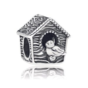Item#797045 Showcasing PANDORA’s detailed craftsmanship. this pretty bird house charm in sterling silver is perfect for those who are nesting or flying the nest. It has a tactile wood-like texture. the engraving Sweet Home. and a pretty songbird perched at its door. Material: Sterling silver