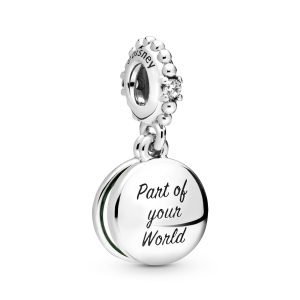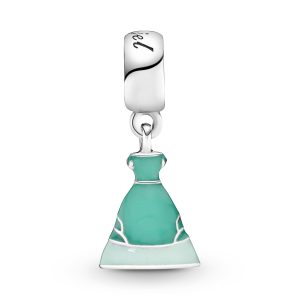791577ENMX From Disney’s The Little Mermaid. Ariel’s stunning emerald green ballgown is shaped as a charm. Made in sterling silver. it’s detailed with sea foam green enamel in a nod to her aquatic beginnings and calm. yet adventurous spirit. The dangle is engraved on the bail with her name. Wear it on a Pandora Moments…