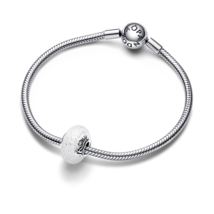 Metal: sterling silverGlass: dichroic; white; transparent MuranoScript: m?m; loveMotif: Murano Glass with raised scriptsSpecial features: glittery white Murano glass with dichroic elements; two different wire inspired scripts on each side of the core; one script forming the word love; the other script combining letters and a heart forming the word m?m; Pandora logo engraved on…