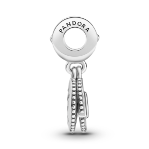 REF#Â 799368C01 Show her she’s your world with the Glitter Globe Mum Dangle Charm. Hand-finished in sterling silver. both dangles are surrounded by a circle decorated with beading. The front dangle includes Mum script with the U replaced by a heart engraved with continents. Hand-applied transparent glittery blue enamel covers the back disc. which features longitude…