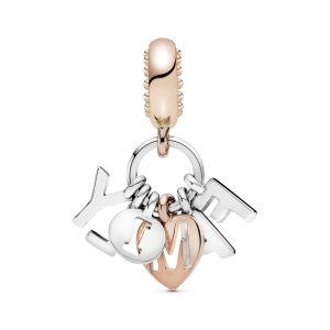 Item #787785CZ Wear what matters the most to you on your bracelet with this playful dangle charm in sterling silver and Pandora Rose. our 14k rose gold-plated unique metal blend. Made to be worn on Pandora Moments bracelets. the two-tone design holds six letter charms that spell out the word family. You can also wear…