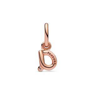 Collection: Pandora Moments Metal: 14k rose gold-plated unique metal blend Stone: 1 flush-set round brilliant-cut clear cubic zirconia Motif: Lowercase script Letter d Special features: Three-dimensional bend wire shaped like a d; Pandora logo engraved on back; stone set in front of the letter; oval-shaped closed bail.聽