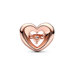 Collection: Pandora Moments Metal: 14k rose gold-plated unique metal blend Stone: 1 half v-prong-set and half prong-set heart-shaped faceted clear cubic zirconiaMotif: 3D open. domed and concave heart with floating stone. Special features: domed heart with cut-out centre with a floating heart-shaped stone dangling from two jump rings; the outline heart on front and back…