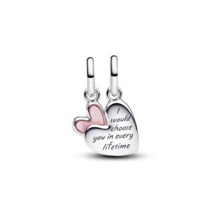Metal: sterling silver Stone: 2 prong-set half heart-shaped faceted clear cubic zirconia Engraving: MOTHER; DAUGHTER Motif: heart-shaped splittable dangle charm with stone Special features: the heart-shaped stone is cut vertically in the middle to allow the charm to be splittable; the two pieces form a heart together; on the back of each piece a functional…