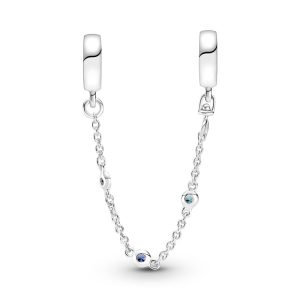 Keep your ocean treasures safe with this sea-inspired safety chain. Made from sterling silver. each bail has threads inside to secure the charms on your Pandora Moments bracelet. It features three blue man-made crystals on the chain to bring a touch of the ocean to your styling.