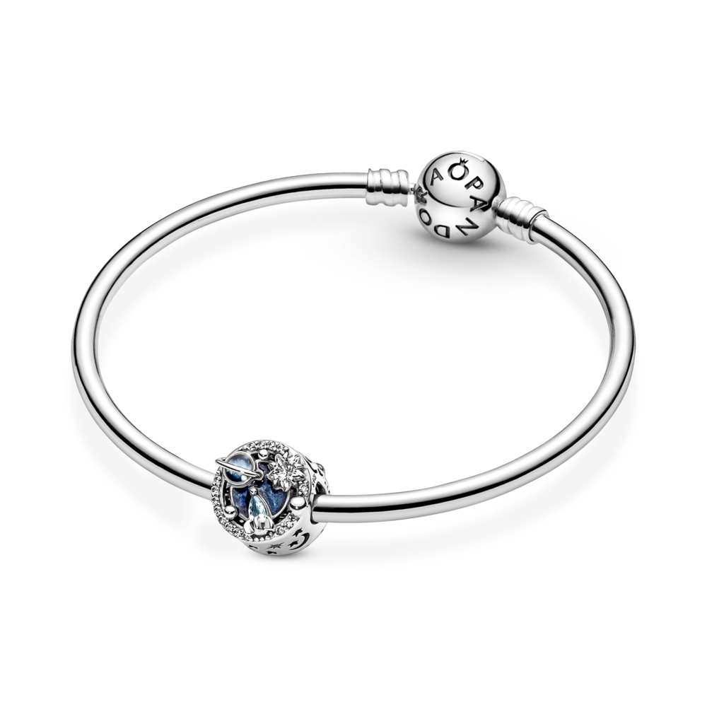 Reflect the serene beauty of the cosmos with A Trip To The Galaxy Charm. One side of the charm features a spaceship made from a pear-shaped icy blue crystal stone. a glittering planet in colourful hand-applied enamel and a star. Cut-out crescent moons. stars and sparkling stones set in stars decorate the sides of the charm. Add the celestial beauty of the galaxy to any look with this luminescent charm.