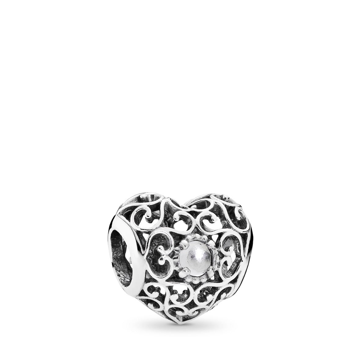 Representing the month of April. PANDORA’s decorative openwork heart charm in sterling silver features a clear rock crystal. symbolising patience. stability and charity. A beautiful gift for those born in April. or to celebrate spring occasions.