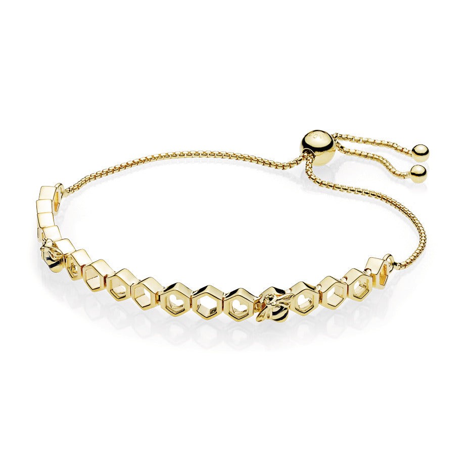 Punctuated with bees striped with hand-applied black enamel. this 14k Gold Plated bracelet in 18k gold-plated sterling silver is shaped like a honeycomb. The adjustable strap features a sliding clasp for the perfect fit.