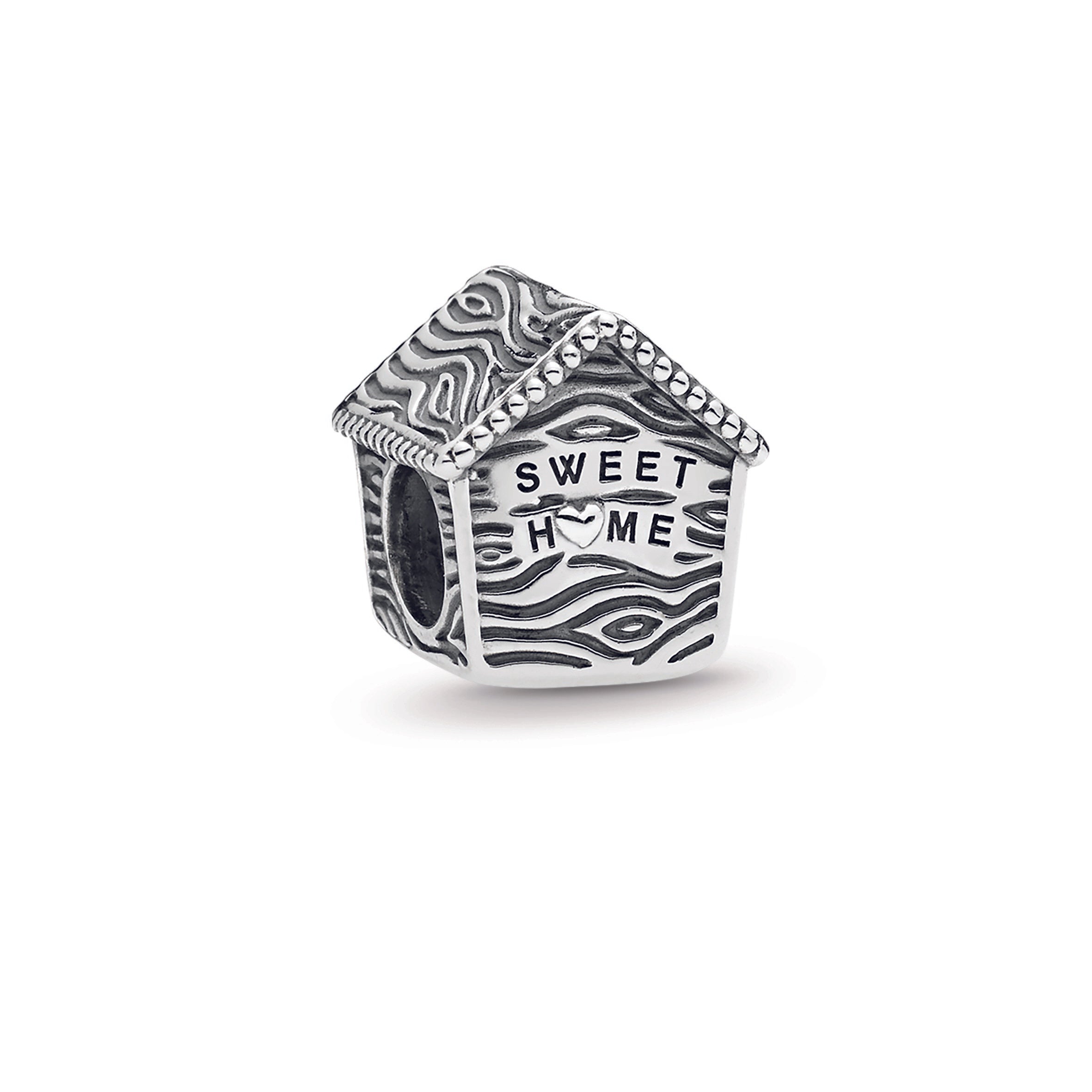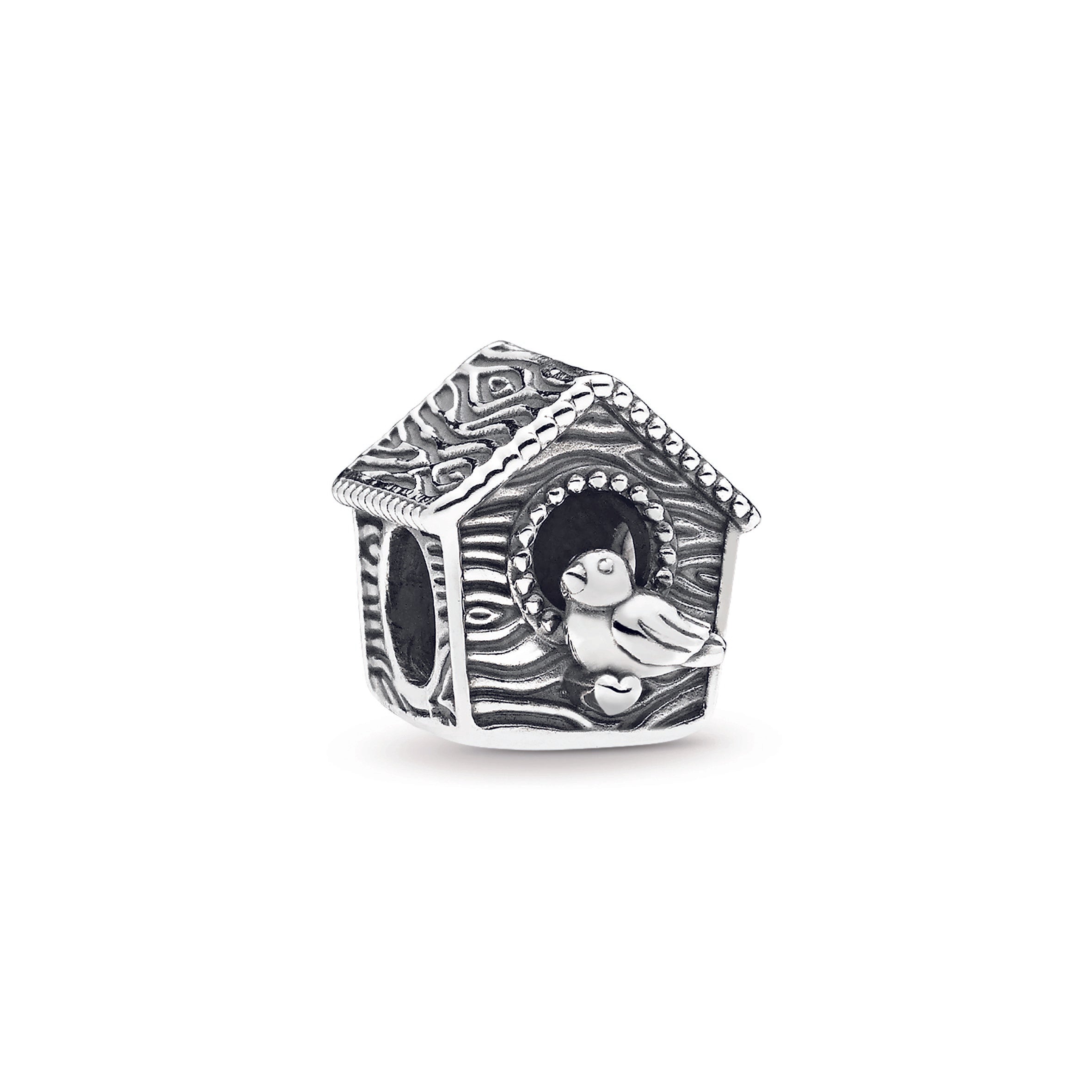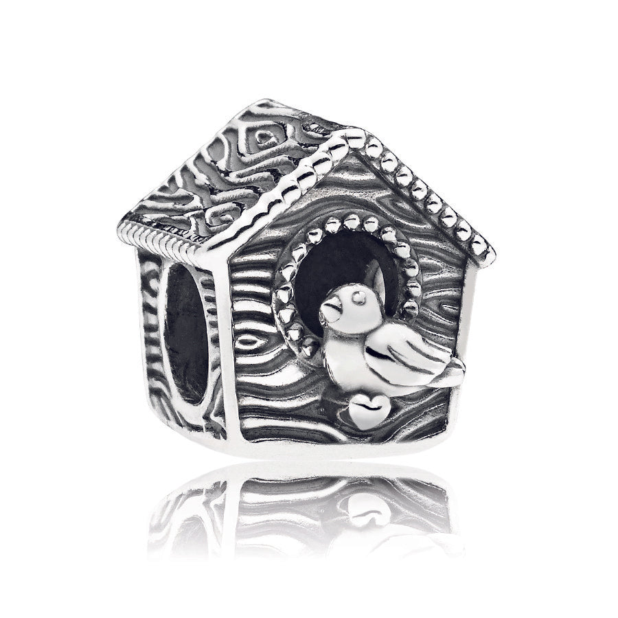 Showcasing PANDORA’s detailed craftsmanship. this pretty bird house charm in sterling silver is perfect for those who are nesting or flying the nest. It has a tactile wood-like texture. the engraving Sweet Home. and a pretty songbird perched at its door.