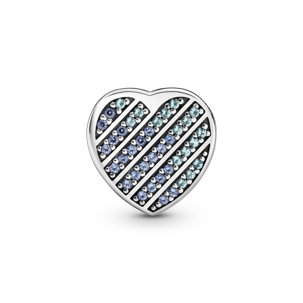 Add a dash of shimmering color to your style with the Blue Pavé Heart Clip Charm. This heart charm is hand-finished in sterling silver with 38 crystals in shades of blue. With the stones set in a linear diagonal pattern. the shades of blue fade from one edge to another. The back side features a polished heart outline. Bring some extra sparkle to your look with this heartfelt charm.