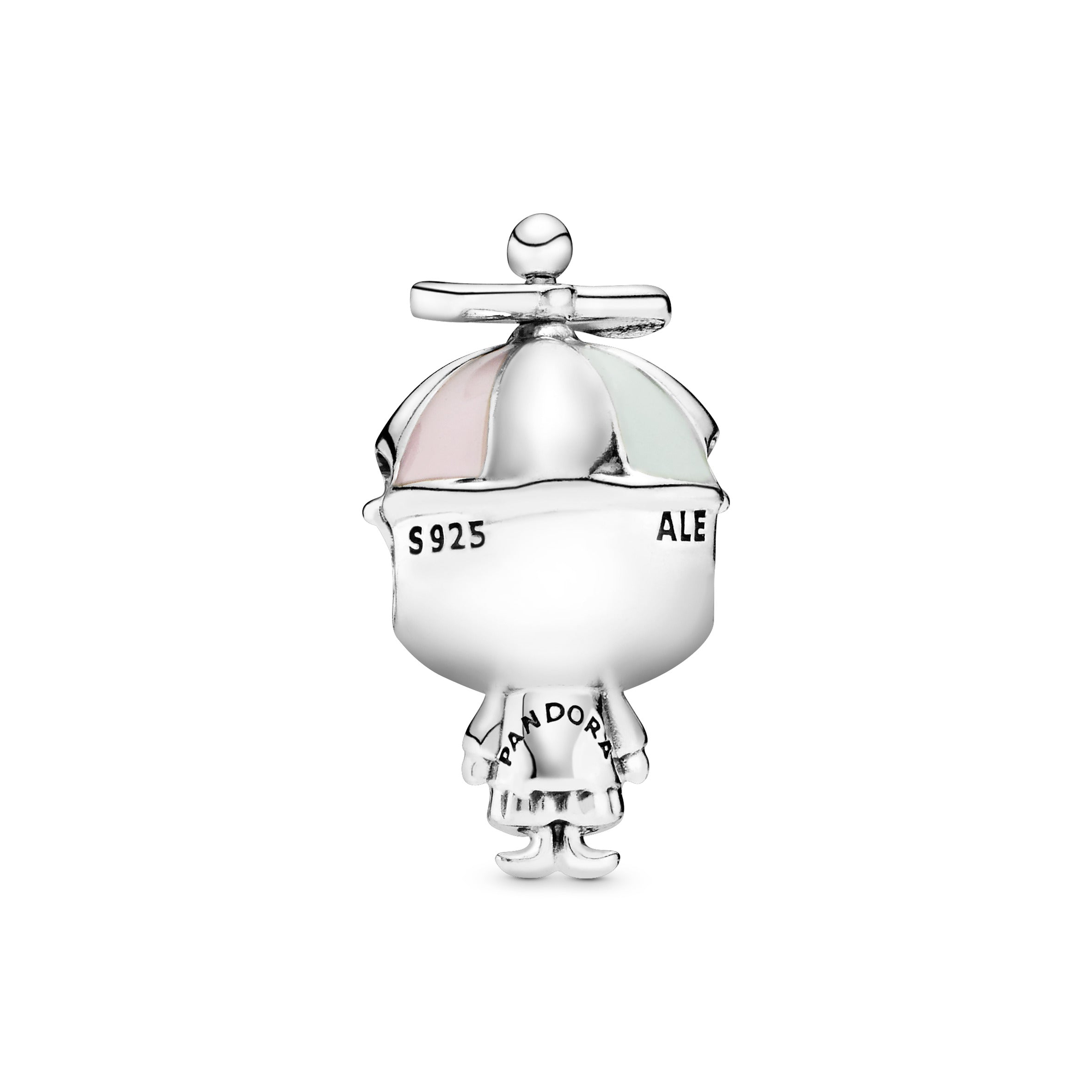Add boyish charm to your bracelet with our character charm in sterling silver. The boy charm is topped with a rotating propeller cap in pastel-toned enamel and detailed on his belly with our Pandora crown O monogram. The charm threads onto your Pandora Moments bracelet through the head. leaving the body to dangle playfully with your every move.