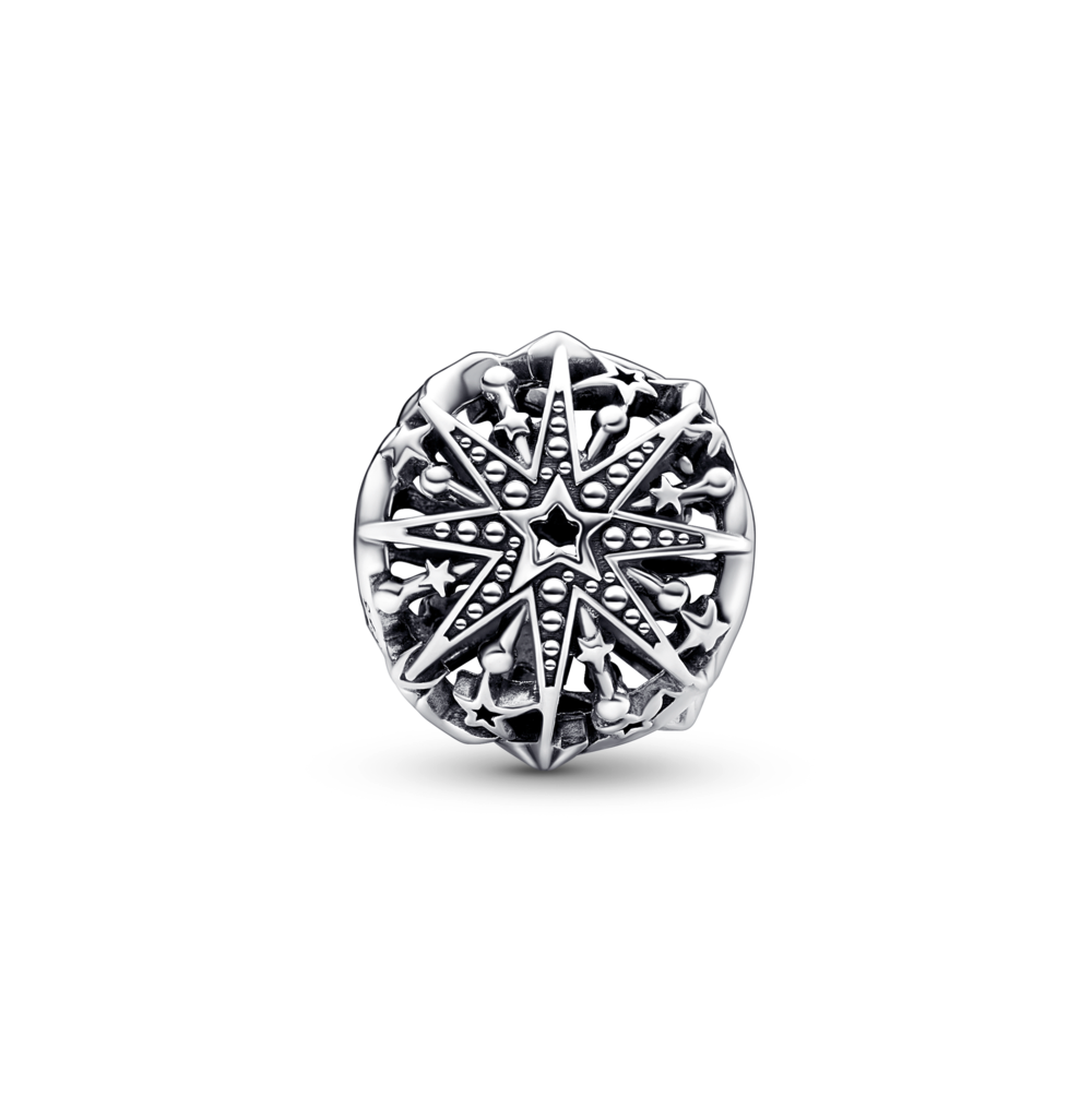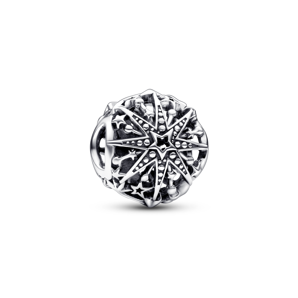 Catch a falling snowflake and wear it on your jewellery. This detailed sterling silver charm features a cut-out five-point star motif on both sides. within a larger eight-point star with intricate openwork details and micro-beading. creating a snowflake-like effect. Small faceted and cut-out stars surround the central star. creating a magical starburst look to bring a celestial touch to your holiday styling.