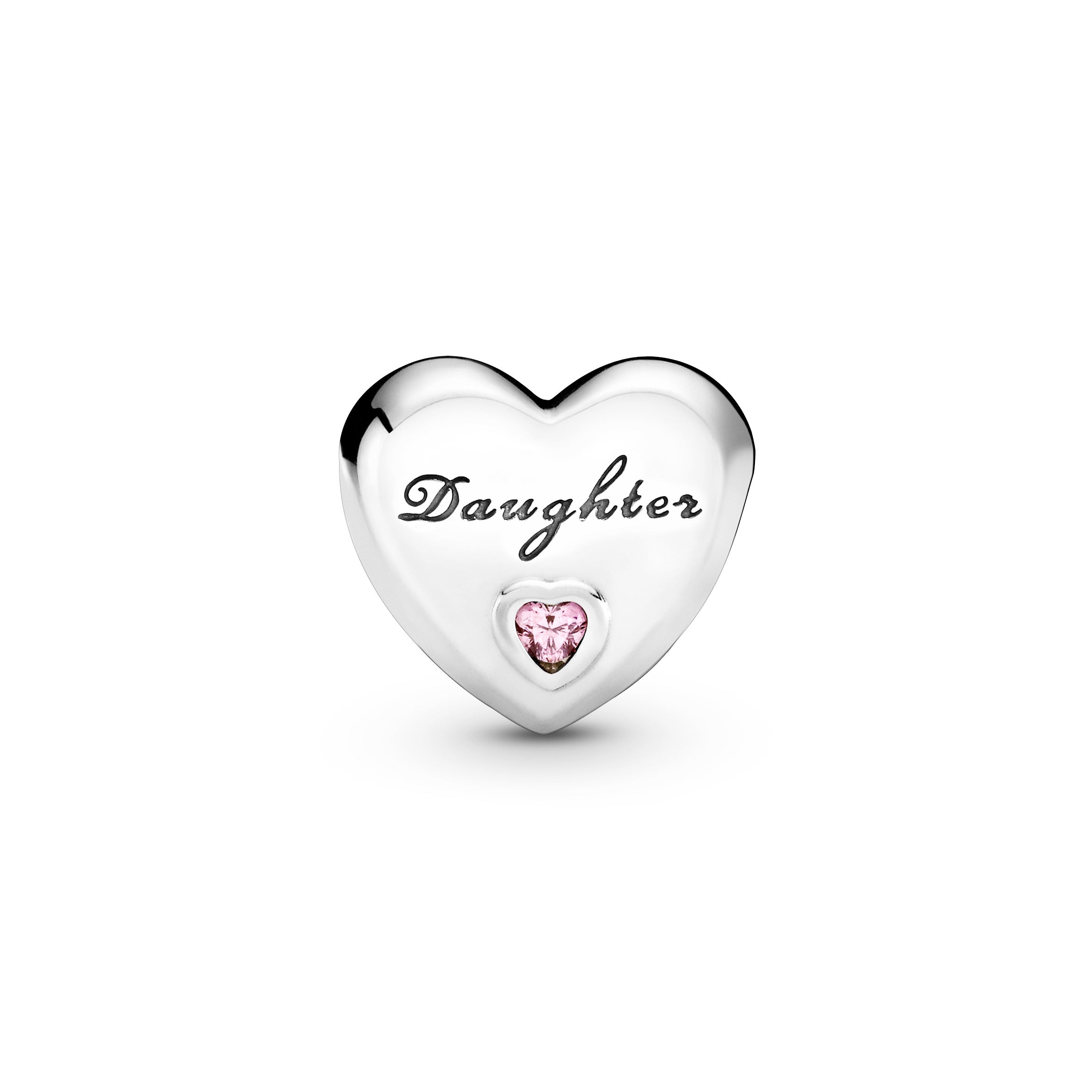 Pandora Moments charms are made for you to express the things you love – something. somewhere or someone. Made to celebrate the bond between parents and daughters. our sterling silver family charm is shaped as a heart. Polished to a high shine. the simple yet meaningful style is trimmed with heart-shaped pink stones and the engraving Daughter. We think it makes a meaningful gift to show the story you share.