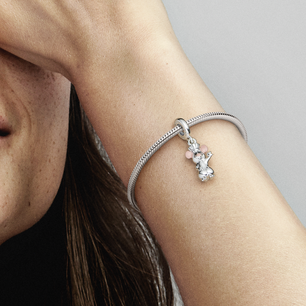 Follow your dreams with Pixar’s Remy. This sterling silver dangle charm features Remy from Disney and Pixar’s Ratatouille wearing his chef’s hat and making a chef’s kiss gesture. Hand-applied pink enamel colours his ears and nose and black enamel brings his eyes to life. Style this charm on your Pandora jewellery as a reminder to follow your heart and never give up.