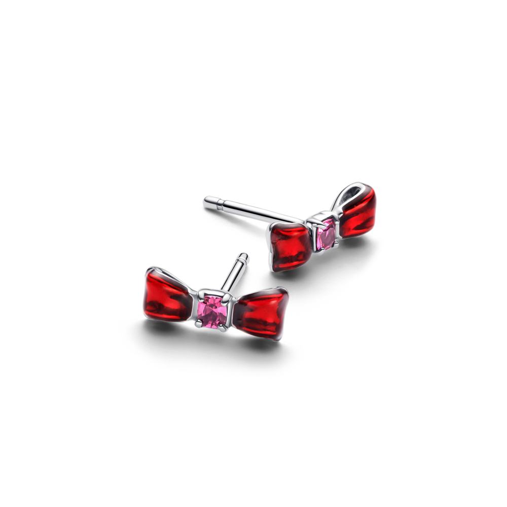Disney Snow White bow sterling silver stud earrings with fuchsia rose crystal and red enamel