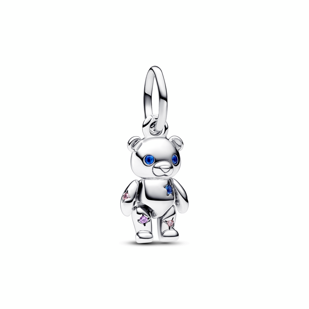 Teddy bear sterling silver dangle with fancy fairy tale pink cubic zirconia. royal purple and stellar blue crystal