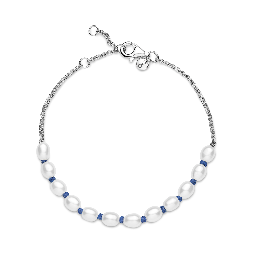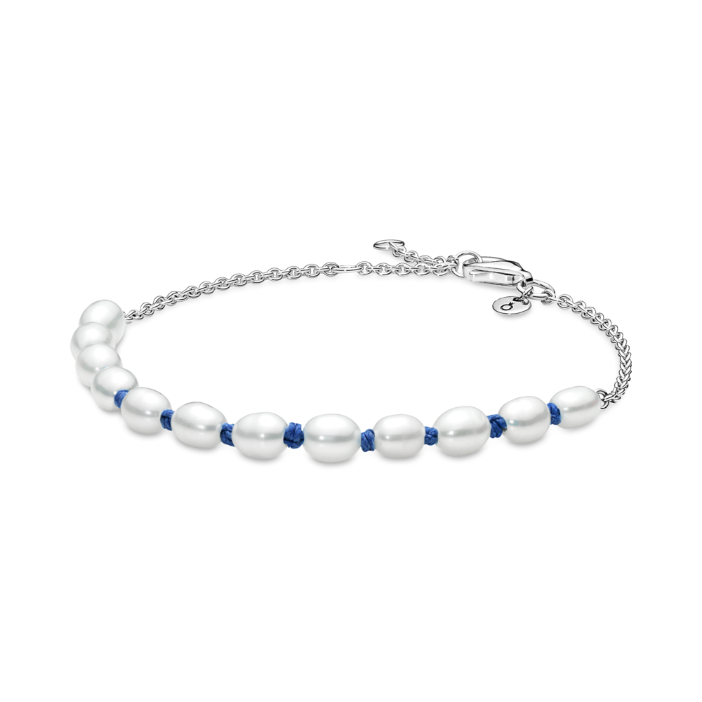 Introducing the perfect pearl statement to layer into your looks. Inspired by sunny days on the beach. one half of this pearl bracelet features a row of freshwater cultured pearls strung onto knotted blue cord. The other half is a sterling silver chain with an easy lobster clasp closure. featuring a small disc near the clasp engraved with the Pandora Crown O. Note: normal wear and tear may occur with natural materials such as pearls.