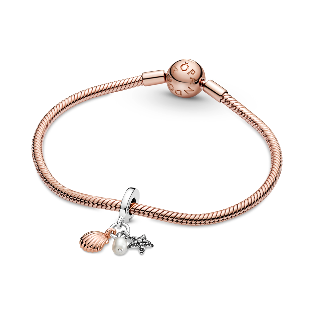 Inspired by the unique beauty of each seashell and pearl in the ocean. this triple charm features a trio of ocean treasures to bring the beach to your bracelet. Hanging from the bail are a sterling silver starfish with raised micro-beads. a freshwater cultured pearl and a 14k rose gold-plated seashell with realistic grooved detailing. The side of the bail has the message You are my treasure. The perfect gift for the beachgoer in your life.
