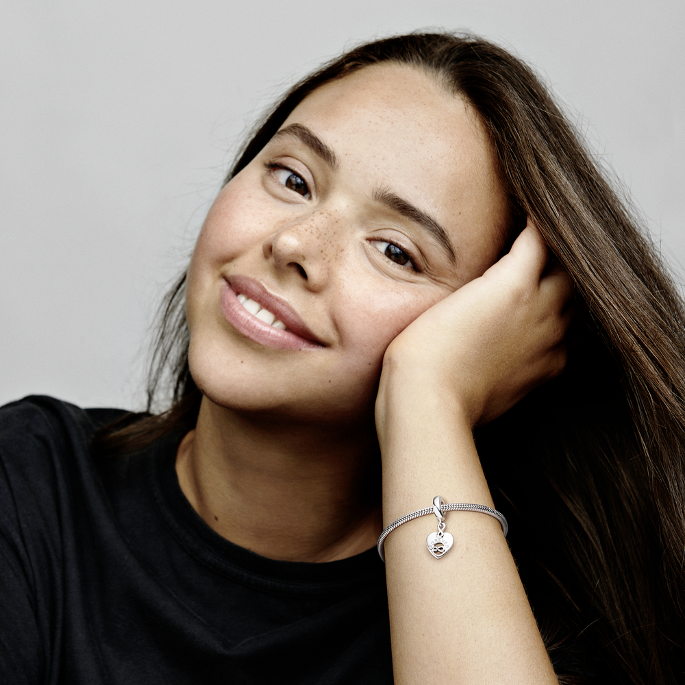 Discover a special charm for your BFF with the Friends Forever Heart Dangle Charm. Hand-finished in sterling silver. this heart-shaped dangle includes an asymmetric infinity sign cut-out with Friends in raised lettering on the front and the engraving Forever on the back. Another infinity sign connects the dangle with the bail. which features a sparkling clear stone. Let your bestie know that your friendship will last a lifetime with this piece.