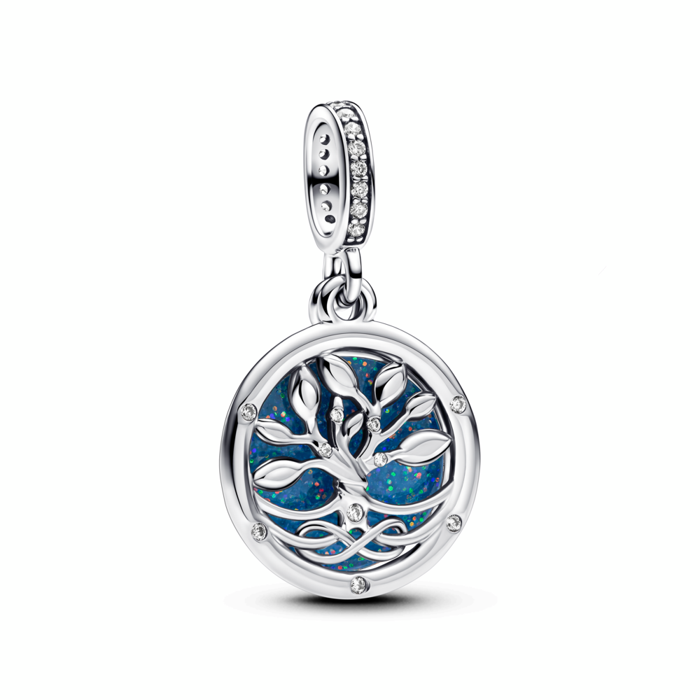 Infinity tree sterling silver double dangle with clear cubic zirconia and glittery glow in the dark blue enamel