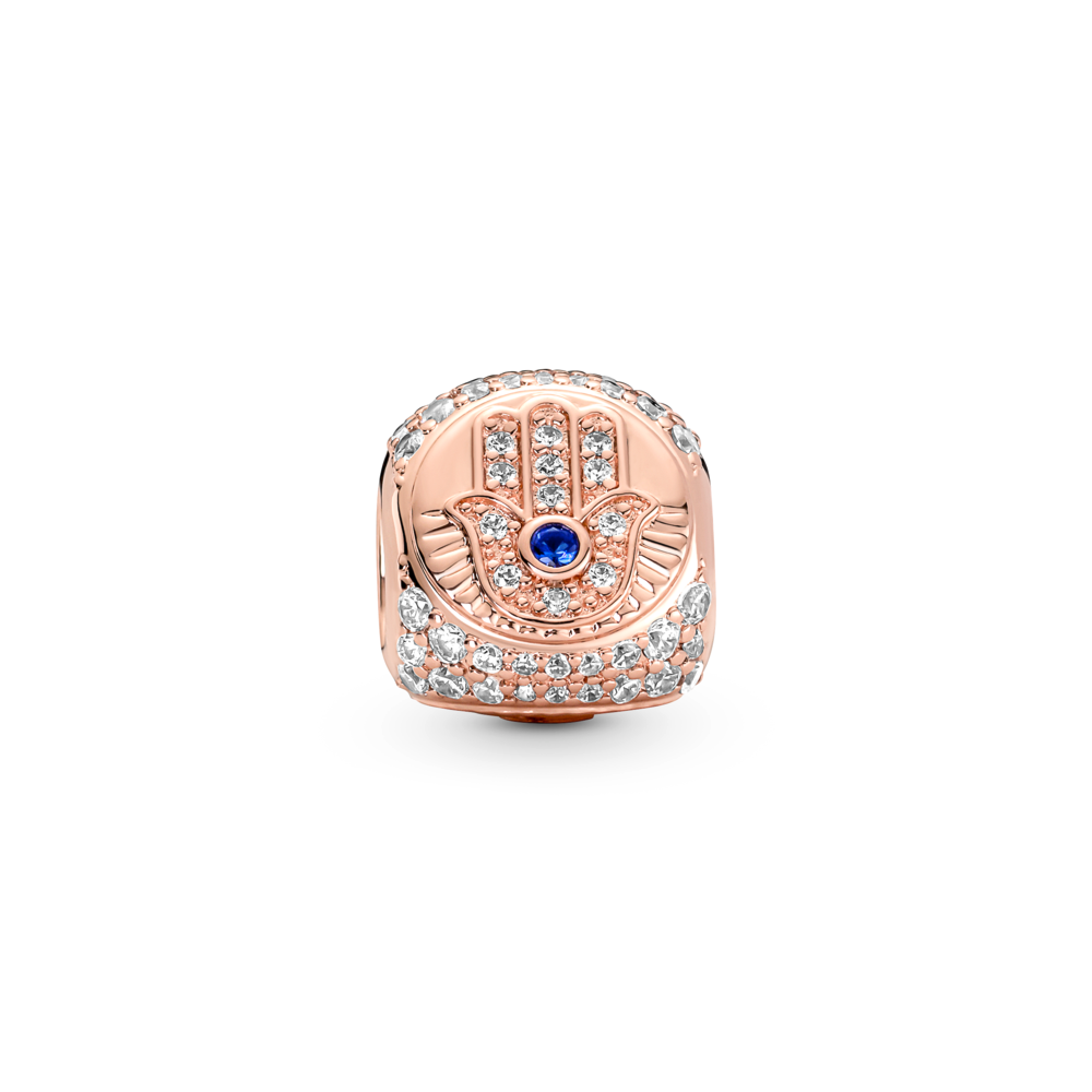 Our Hamsa. All-seeing Eye & Feather Three-sided Charm tells a new story on every side. A shining eye set with a vibrant blue crystal decorates one edge. while on another a raised Hamsa design features clear pav茅 detailing and on the third. a raised feather is finished with white enamel. Each considered talismans of protection. add these meaningful symbols to your jewellery collection to make your styling even more special.