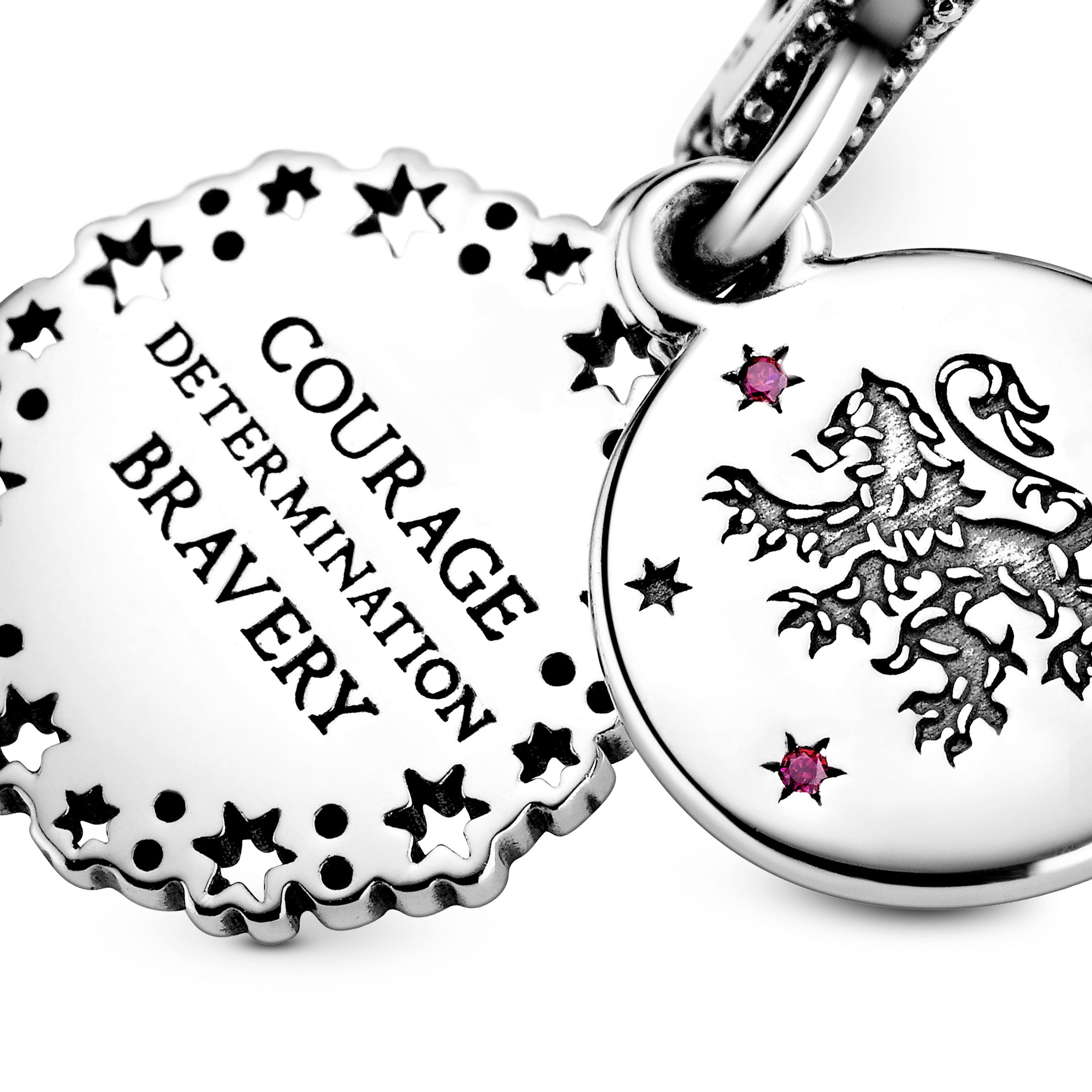 Gryffindor House is home to best friends Harry. Ron and Hermione. along with wizards Dumbledore and Sirius Black. all of whom symbolize the house attributes: bravery. daring and chivalry. The Harry Potter. Gryffindor charm is a double dangle with the house crest surrounded by brilliant-cut red cubic zirconia stars. The bail of each house dangle is shaped like the Hogwarts school crest.
