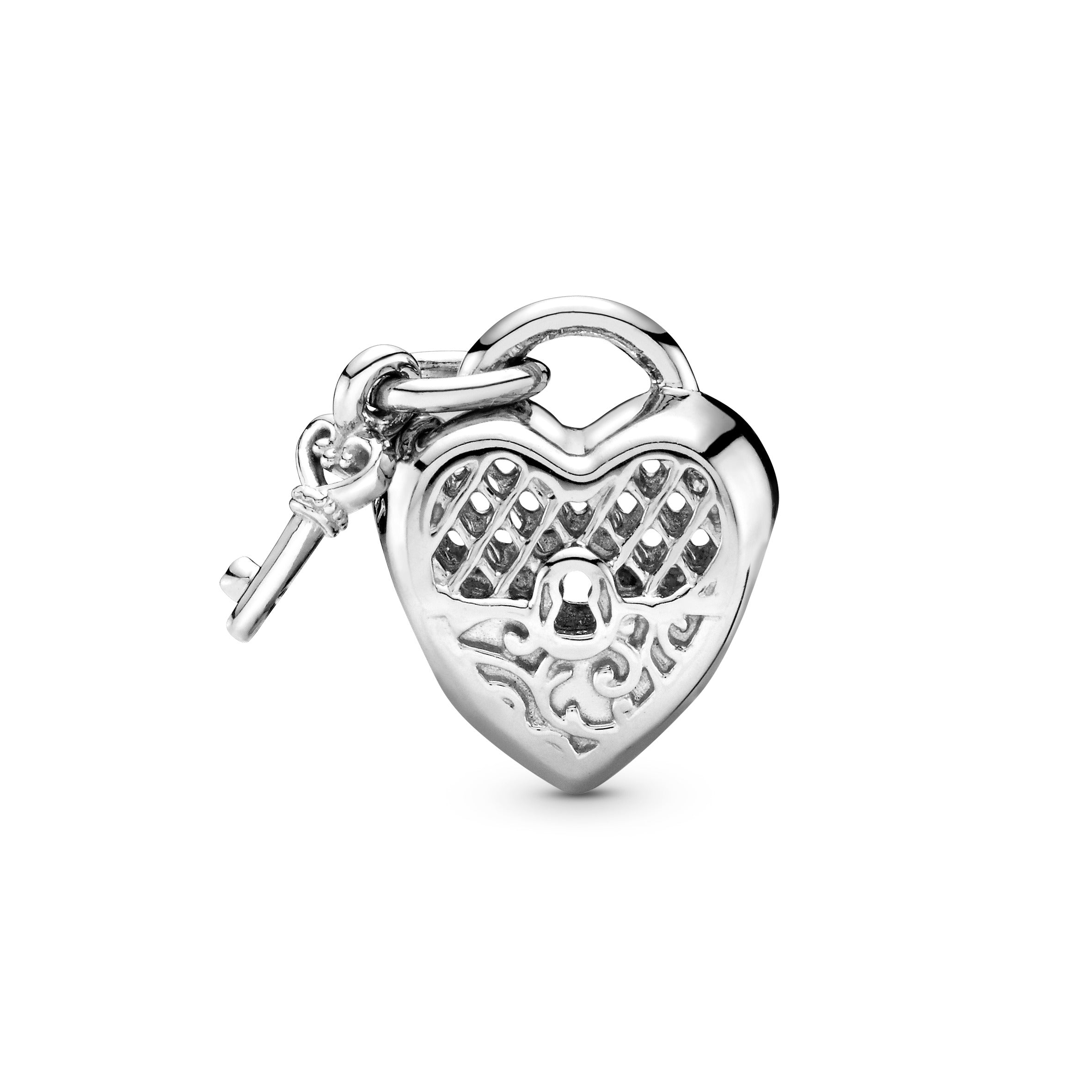 Tell your own style love story with this hand-finished heart padlock charm. A symbol of unbreakable bonds. the sterling silver charm is detailed on the front with latticework and decorative swirls. It’s engraved with the message Love You. making it the perfect piece to gift to someone you care about. The miniature key dangle creates subtle movement when worn on your favourite Pandora Moments charm bracelet.