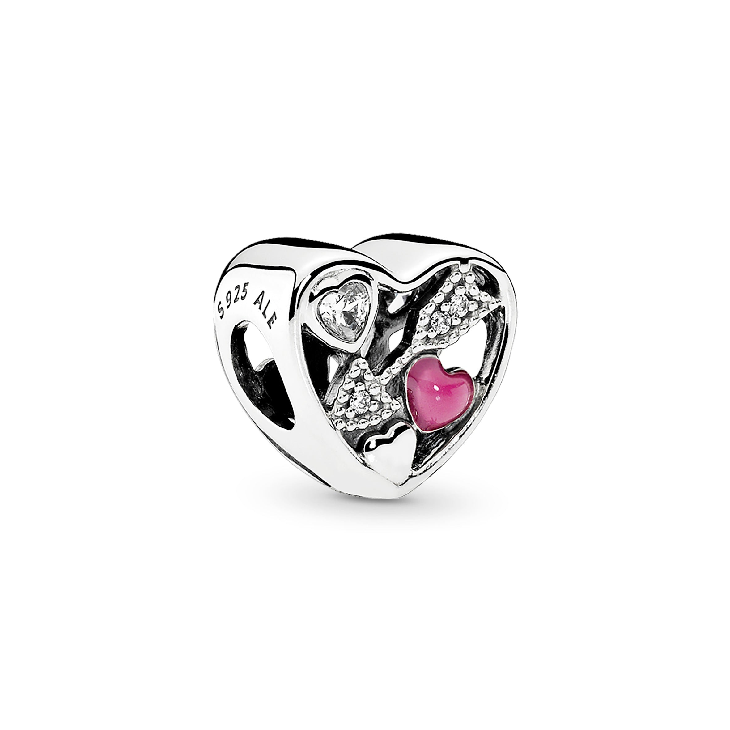 This hand-finished charm playfully conveys the feeling of being struck by love. A sparkling Cupid’s arrow. a heart-shaped stone and a magenta enamel heart bring a fun. pop-art twist to the universally loved heart shape.