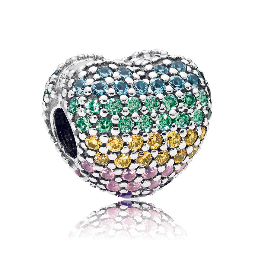 Wear the colours of your heart with this classic piece that’s both beautiful and meaningful. The sterling silver clip charm is shaped as a heart and detailed with over one hundred colourful crystals and cubic zirconia. The glittering design lends a romantic touch to Pandora Moments bracelets. Use it to space out stylings – or as an adornment in its own right.