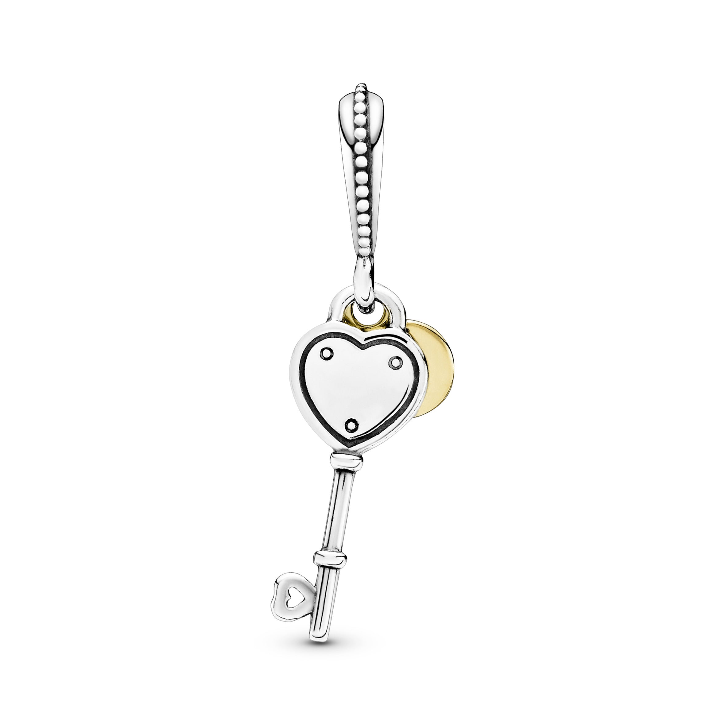 Lock down your personal style with this two-tone dangle charm. The heart-shaped key dangle charm is hand finished in sterling silver and features a keyhole made from 14k gold. To continue the theme. key is shaped as a heart for a romantic touch. Wear it on a your favourite necklace chain as a symbol of love or add it to your Pandora Moments charm collection.