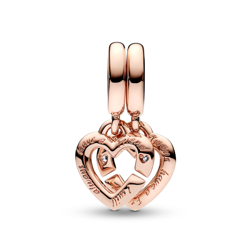 Show off your sisterly bonds with the Linked Sister Hearts Split Dangle Charm. Finished in warm 14k rose gold plating. this charm includes two linked open hearts. each featuring a sparkling clear cubic zirconia stone and engraving (one says Sis and the other reads Sister). On the back. each heart has small heart-shaped cut-outs and is engraved with I will always have a friend. The hearts can be separated. so one can be gifted to your sister 鈥?a reminder of your forever bond.
