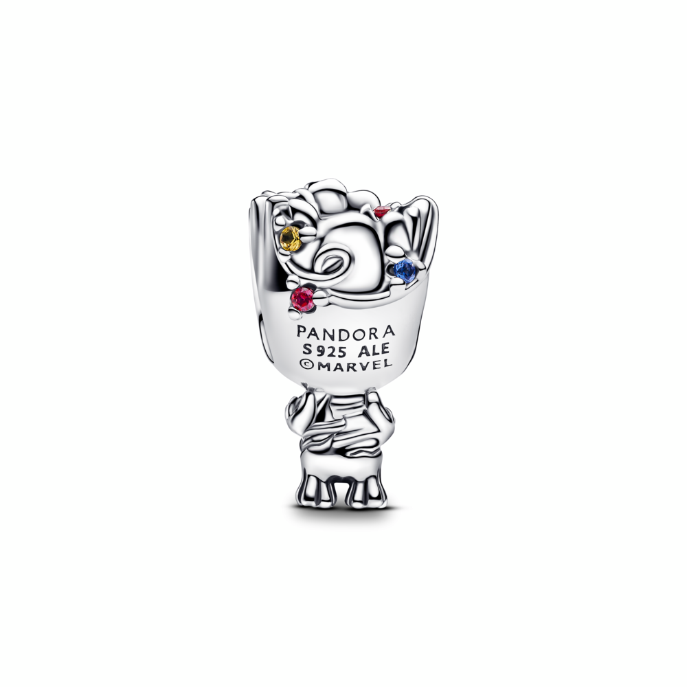 Marvel Groot sterling silver charm with clear and red cubic zirconia. blue. green and yellow crystal and black enamel