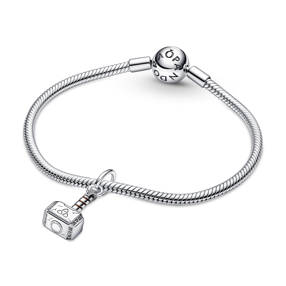Bring the thunder with our Marvel The Avengers Thor’s Hammer Dangle Charm and share your love for the Marvel Cinematic Universe with the world. Hand-finished in sterling silver. Thor’s hammer is brought to life with swirling brown enamel. engraved scratch marks and Asgardian-style rune symbols. The side of the hammer is engraved with Worthy as a reminder of the source of Thor’s power. Add this charm and more of your favourite heroes to our Pandora Moments Marvel The Avengers Logo Clasp Snake Chain Bracelet. This Marvel must-have arrives with exclusive packaging making this an extra-special addition to your collection.