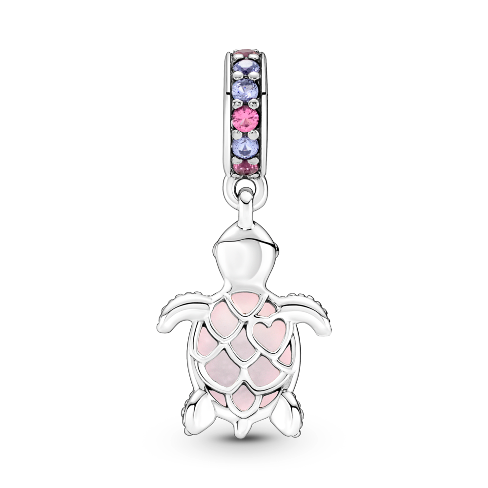 Our much-loved sea turtle charm is joined by a new friend in frosted pink. This sterling silver dangle charm features pink and purple man-made crystals on the bail and frosted Murano glass as its shell with unique shimmering flecks that catch the light. The belly of the sea turtle has a sterling silver cut-out pattern with an off-centre heart to create a pretty scale-like effect. Carry more turtle friends on your Pandora Moments bracelet or charm holders.