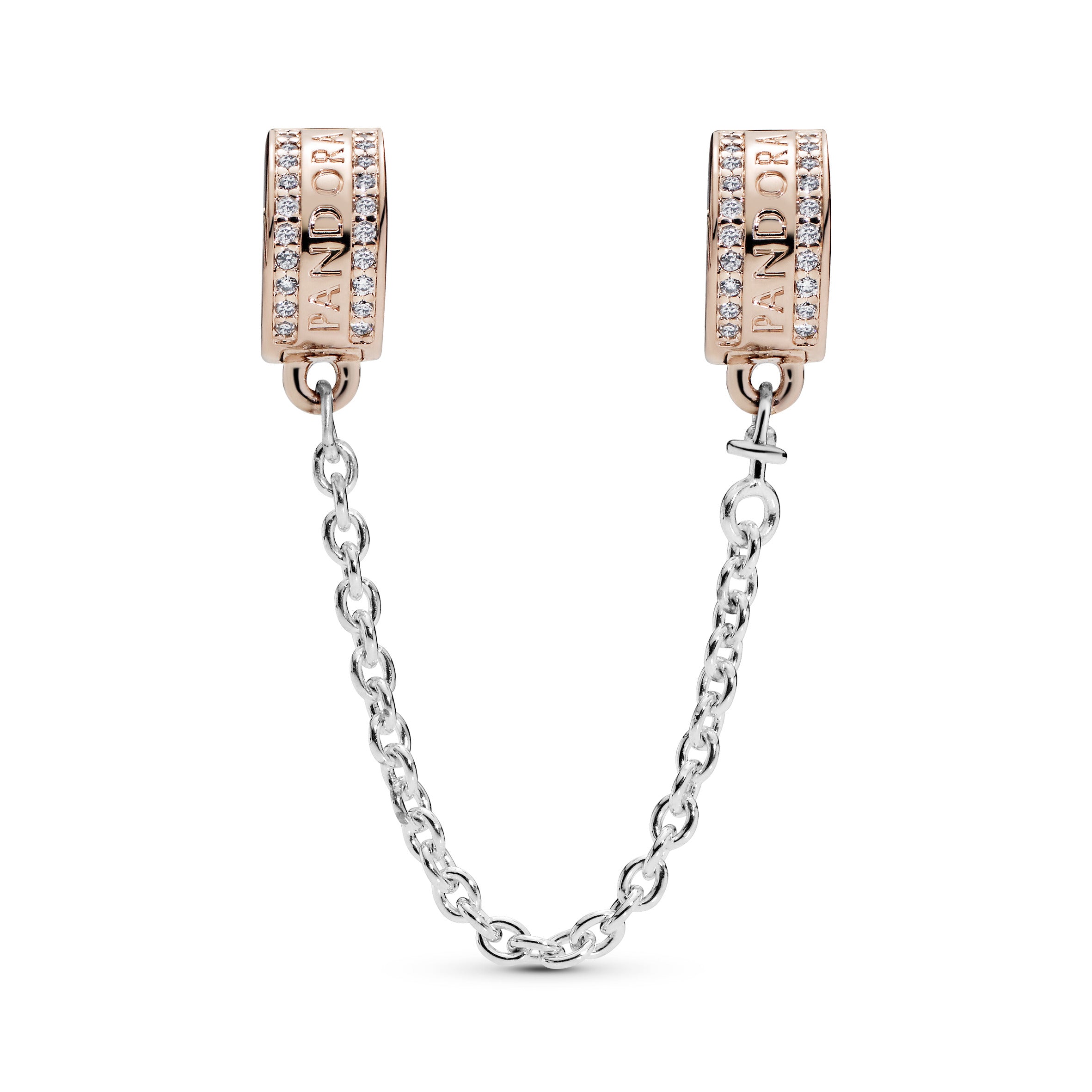 Keep your charms in place with our safety chain specially designed for Pandora Moments bracelets. Hand-finished in sterling silver and Pandora Rose. 14k rose gold-plated unique metal blend. the charm features clips that are detailed with our logo as well as lines of sparkling clear cubic zirconia. The safety chain charm is also fitted with swivel ends to prevent it from tangling. so you can be sure that your charm collection stays in place.