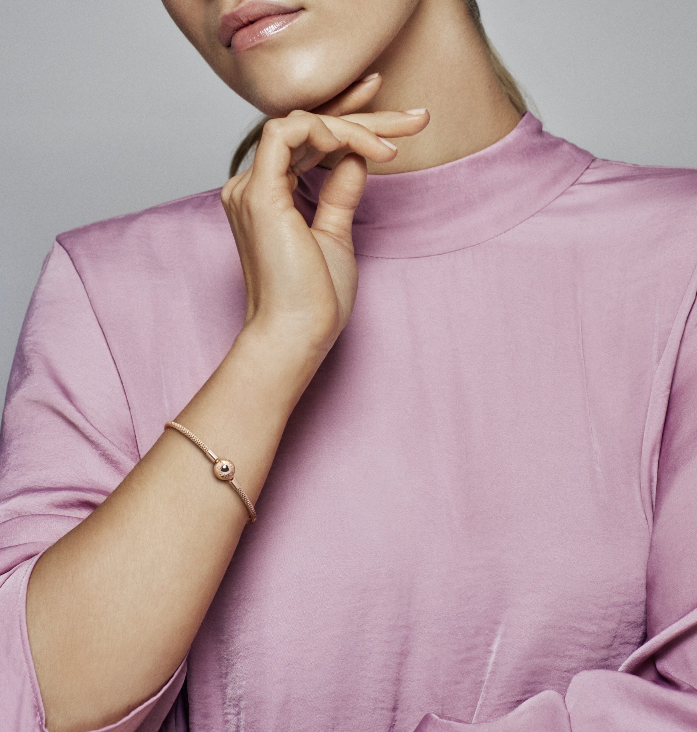 Start your next charm collection with this stylish carrier with a textured finish. The Pandora Rose bracelet is crafted from our unique metal blend with a titanium core and plated with 14k rose gold. The woven mesh is perfect for adding contrast to layered looks and makes for effortless everyday styling. Wear yours solo or stack with other charm bracelets. adding favourite charms to suit your mood.
