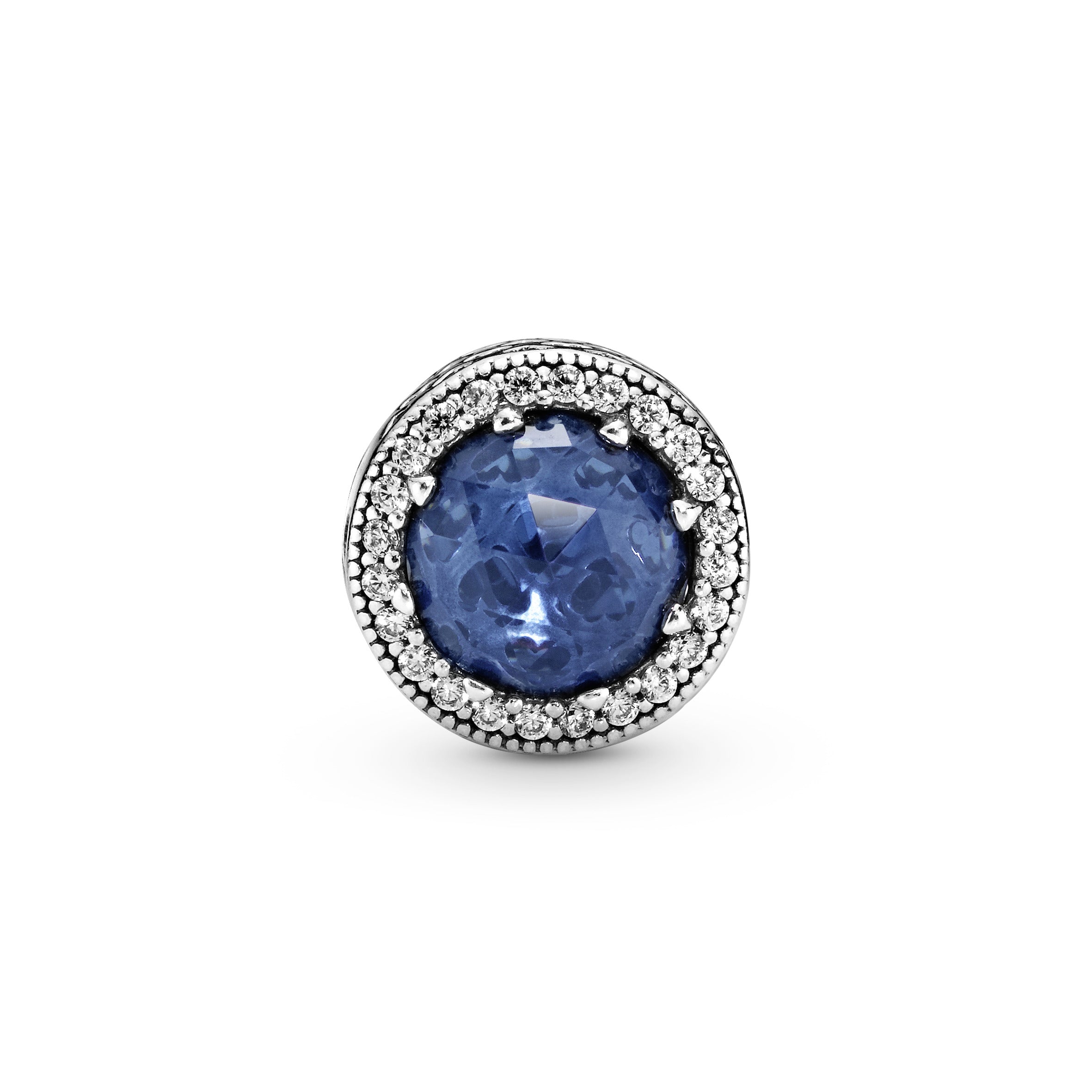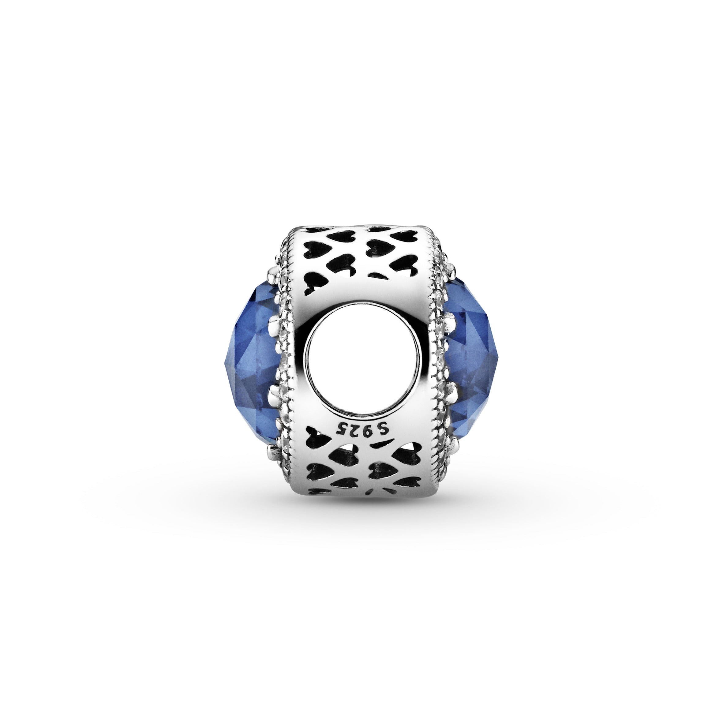Light up the night with this glamorous moonlight blue charm. Finely crafted in sterling silver. it is set with a sparkling dark blue crystal surrounded by pavé-set cubic zirconia stones. The delicate cut-out heart detailing on the sides enhances its beauty. Style it with sterling silver charms on a chain bracelet or wear it alone as a dazzling pendant on a Pandora necklace chain.