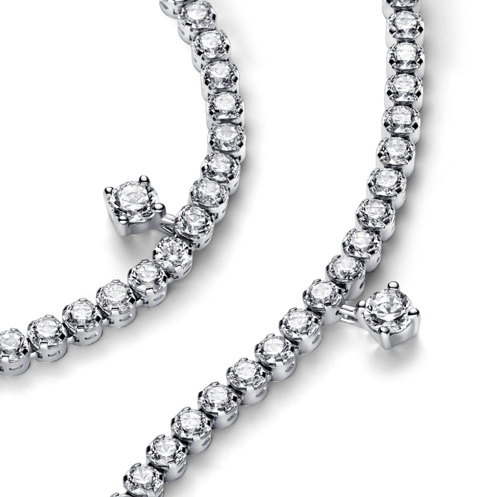 Make your holiday season sparkle. This sterling silver Sparkling Drops Tennis Bracelet is made up of a row of sparkling round brilliant cut cubic zirconia. decorated with dangling stones along the chain to make a statement fit for any occasion. Wear it on its own or stack bracelets of different colours and metal finishes for a modern look.