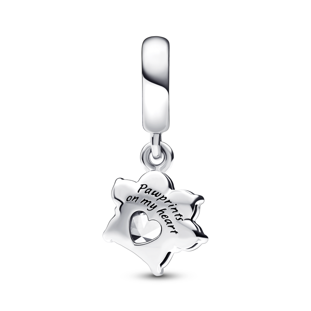 Elevate your love for your best friend with the Sparkling Pet Paw Print Dangle Charm. Cast in sterling silver. it features four sparkling stones as the toes and a specially crafted centre stone that makes up the paw pad. The back of the charm is inscribed with the words: Pawprints on my heart. Carry this charm as a reminder of how much your furry companion enriches your life.
