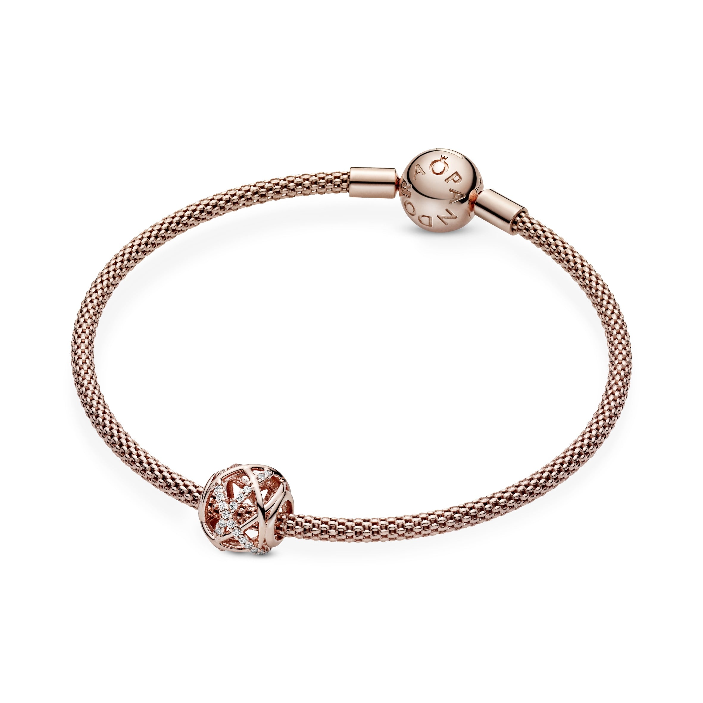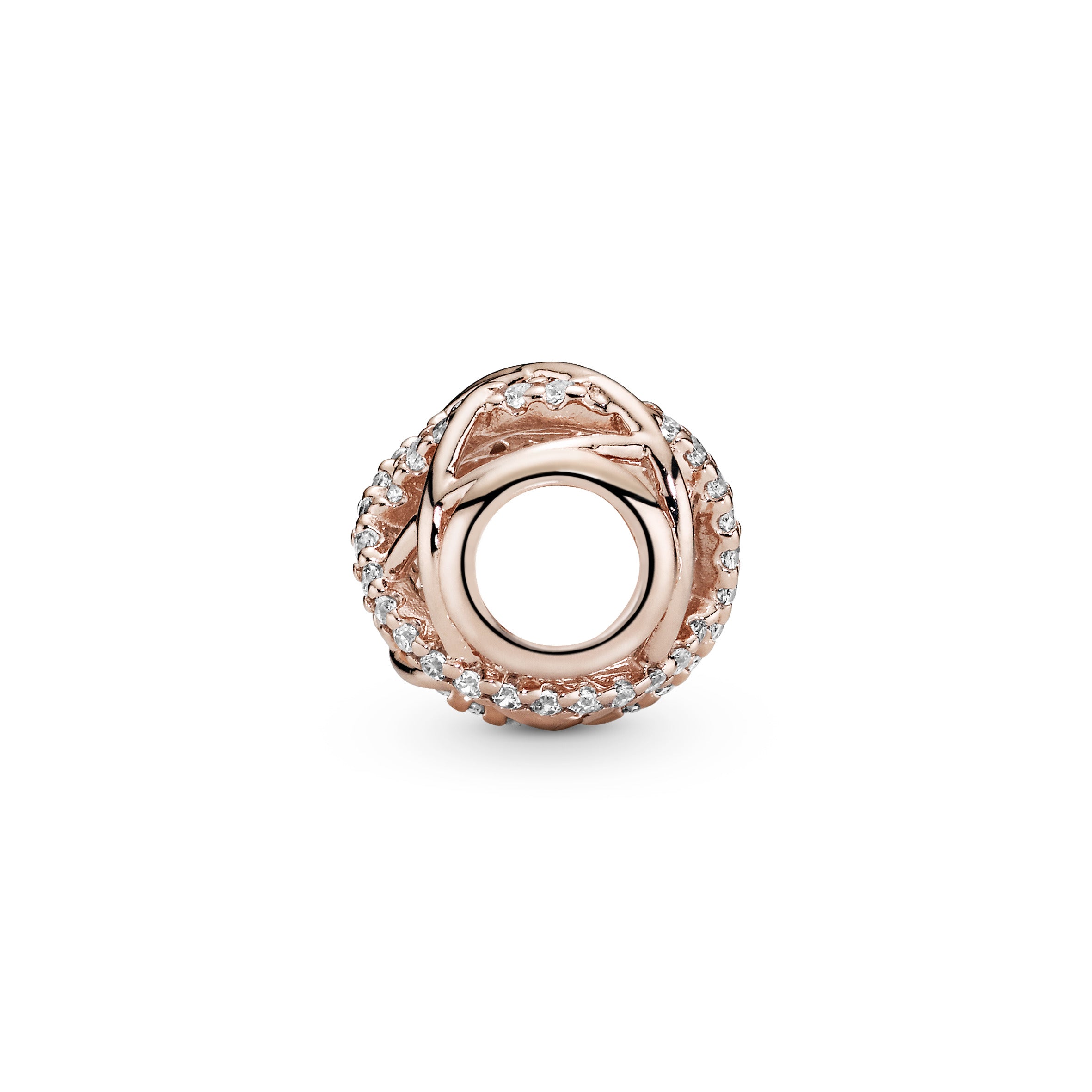 Give in to the magic of this charm with sparkling and polished lines. Finely crafted in Pandora Rose. a 14k rose gold-plated unique metal blend. the abstract design weaves together strands of polished metal and shimmering cubic zirconia stones for an eye-catching effect. Mix with the matching charms in other metals for a modern. multi-dimensional look.