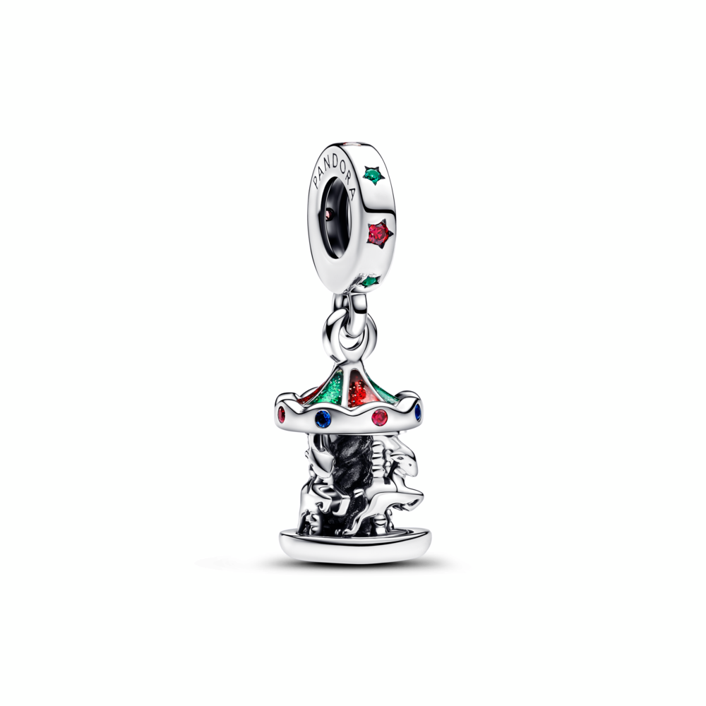 Moveable carousel sterling silver dangle with glittery red and green enamel. red cubic zirconia. green and blue crystal