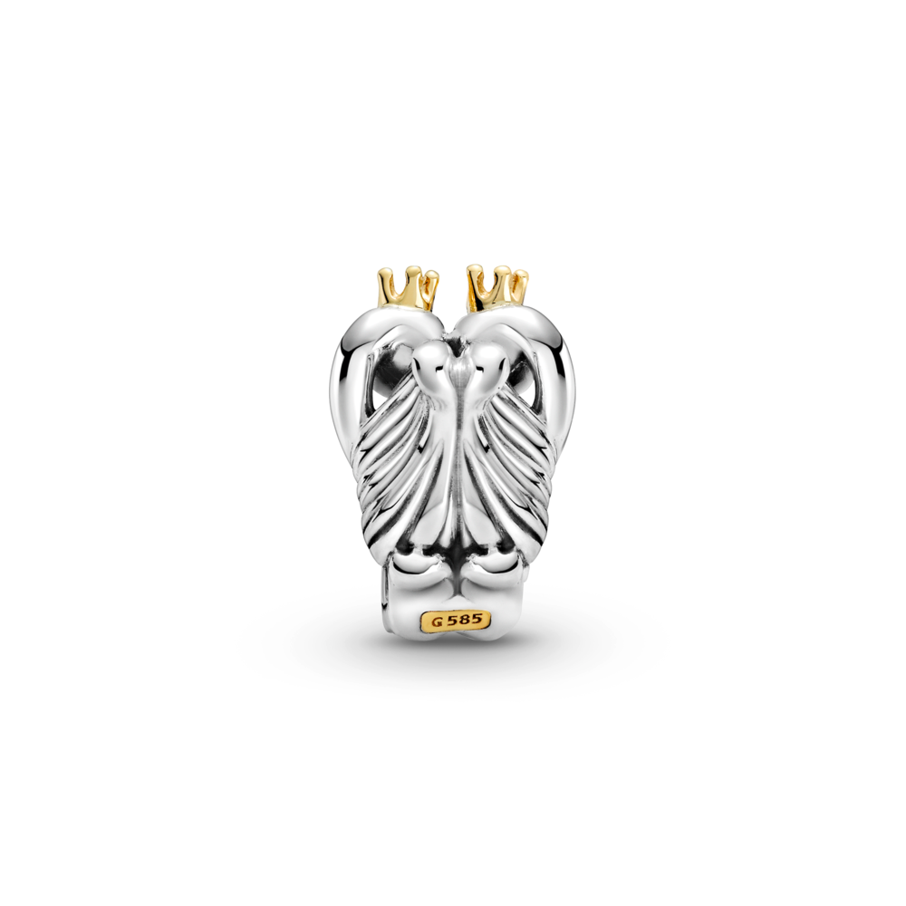Embody graceful elegance with the Two-tone Swans & Heart Charm. Hand-finished in sterling silver and 14k gold. this charm features two swans curving to form a heart shape and has a gold hallmark stamp disc on the bottom. With lifelike details including feathered wings. eyes and beaks. the swans wear 14k gold crowns on their heads and represent love. magic and happily ever after. Never forget the power of two becoming one when you wear this heartfelt charm.