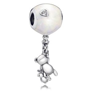 Item#797034EN23 Reminisce over childhood memories with this dangle charm. Depicting a teddy bear and his rabbit friend floating from a balloon. this adorable design adds delicate movement to a Pandora Moments bracelet or necklace. Crafted from sterling silver. it’s finished with shimmering silver enamel and a heart-shaped cubic zirconia. Wear it as part of the…