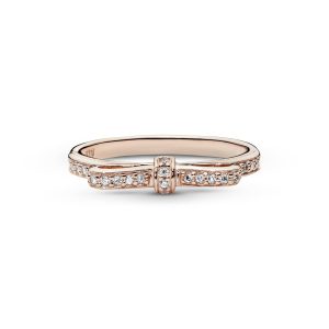 item#180906cz Bows are a great way to add sophistication to any look. Cast from Pandora Rose (14k rose gold-plated unique metal blend) and sculpted into the shape of a bow. this dainty band ring is dotted with scores of shimmering cubic zirconia that glisten as they catch the light. Stack it with similar styles from…